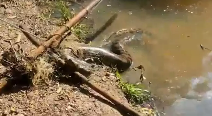 Uma sucuri de aproximadamente 4 metros foi resgatada em um açude na região do município de Itaporã. O animal estava enrolado em uma rede de pesca, mas sem sinais de ferimentos.