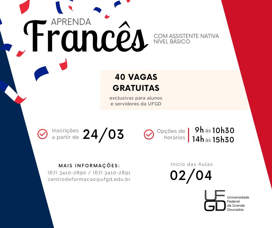 O Centro de Formação da Pró-reitoria de Extensão de Cultura (PROEC) da UFGD abrirá, em 24 de março, as inscrições para o curso de Francês com assistente nativa – Turmas de Nível Básico. Esta oportunidade é direcionada para estudantes e servidores da instituição, com aulas a partir de 2 de abril.