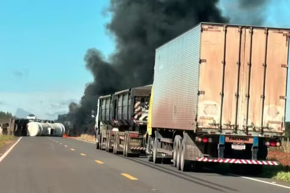 De acordo com as primeiras informações, a carreta de combustível tombou, o que causou o incêndio e deixou o trânsito parado nos dois sentidos na rodovia e sem previsão de liberação.