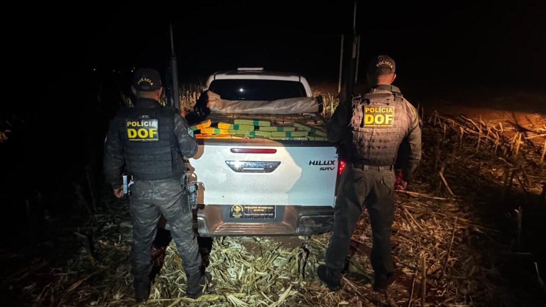 Os policiais faziam bloqueio na BR-463, entre Ponta Porã e Dourados, próximo ao Rio Dourado, quando o condutor do veículo não obedeceu a ordem de parada e tentou fugir. Após alguns quilômetros em acompanhamento, ele arremessou o automóvel em uma plantação de milho e tentou fugir a pé. Duas pessoas que estavam na caminhonete foram alcançadas e presas.