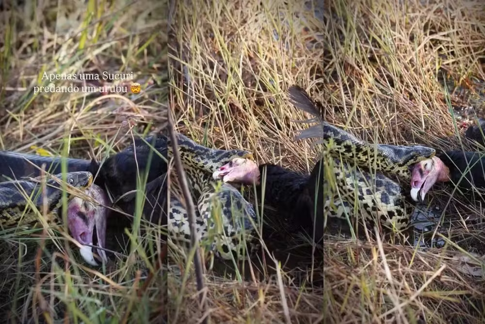 Uma sucuri foi flagrada nesta quinta-feira (4) arrastando um urubu após capturá-lo com um bote no Pantanal sul-mato-grossense. A cena foi registrada pela guia e fotógrafa da ONG Onçafari, Giovanna Leite, e publicada em suas redes sociais. Veja o vídeo abaixo.