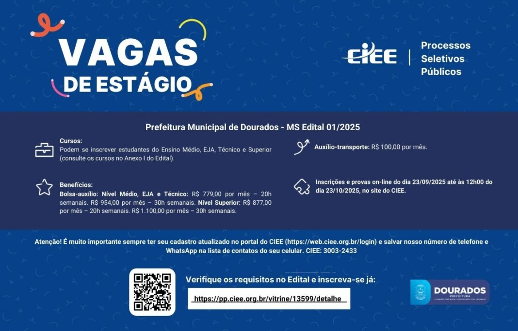 A Prefeitura de Dourados lançou o Edital nº 01/2025 para seleção de estagiários, em parceria com o Centro de Integração Empresa-Escola – CIEE. O processo oferece oportunidades para estudantes do Ensino Médio, Educação de Jovens e Adultos (EJA), cursos Técnicos e de Ensino Superior.