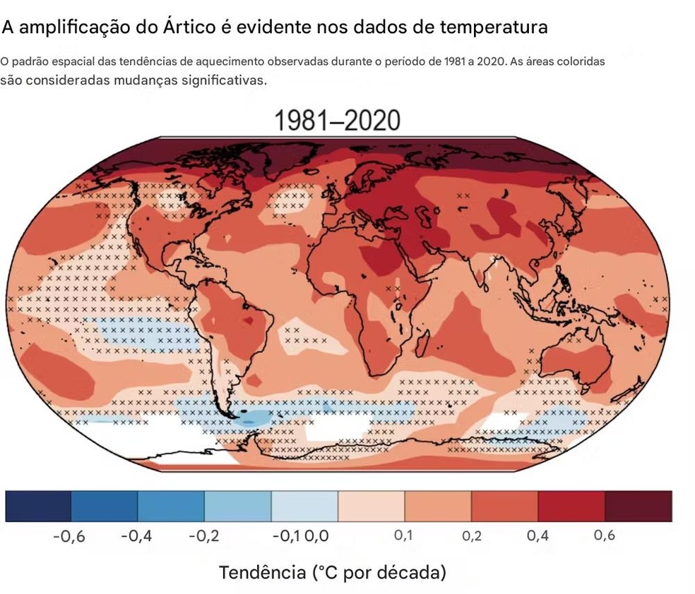 Esse fenômeno, chamado amplificação ártica, é hoje uma característica bem estabelecida do aquecimento global. Está presente em observações atuais e em modelos mais recentes.