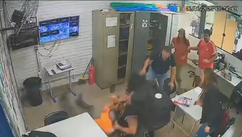 As imagens mostram o momento que o homem entra na sala de coordenação e dá uma sequência de socos na cabeça do educador, que tenta se proteger enquanto é contido por outros funcionários.