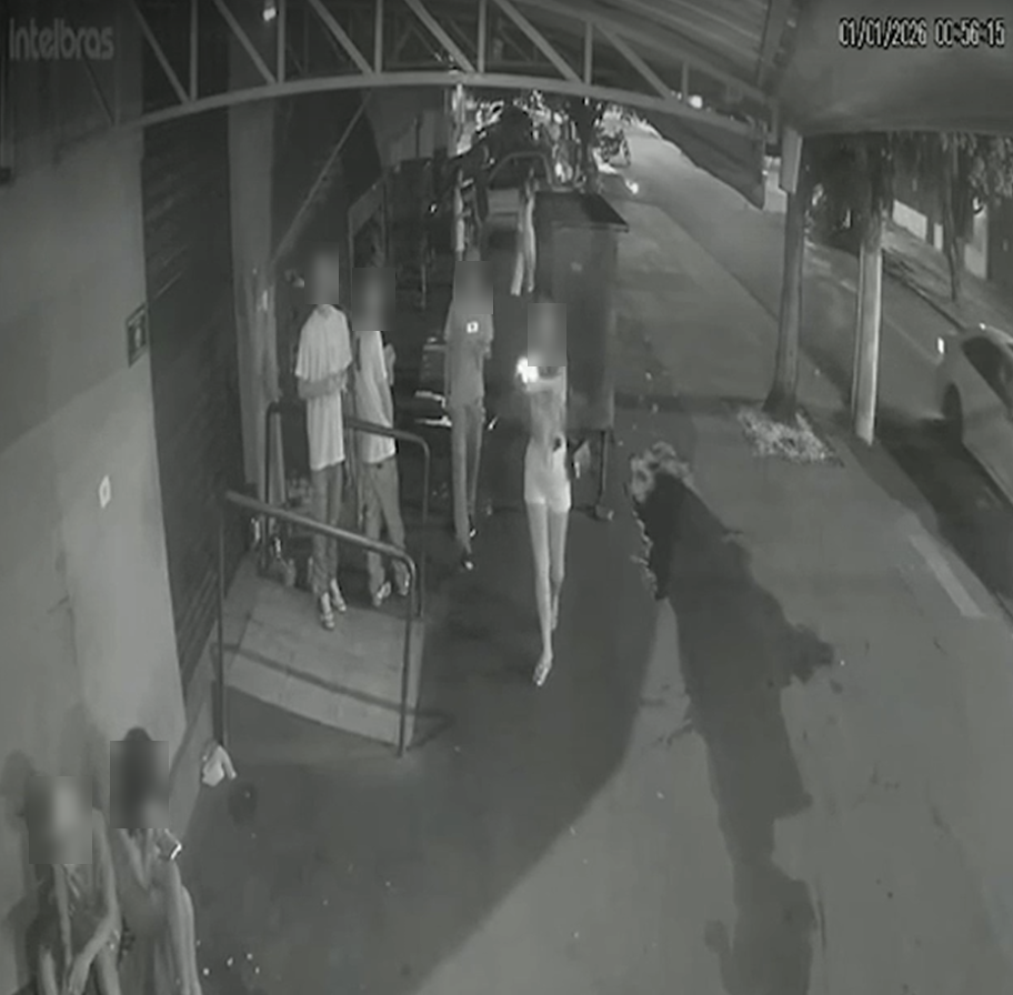 As imagens mostram, primeiro, um homem que acompanhava a mulher disparar um tiro para cima. Outro integrante do grupo solta fogos de artifício. Em seguida, a mulher joga a bebida que segurava no asfalto, pega a arma da mão do rapaz e atira na direção da conveniência.