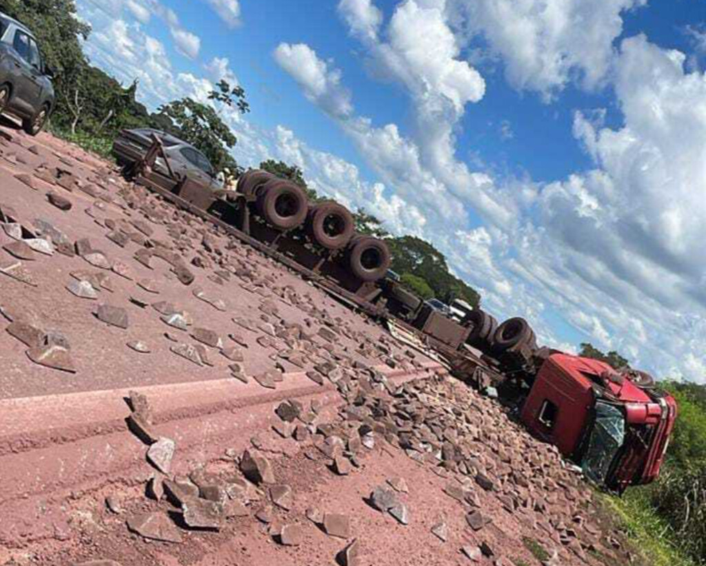 Carreta carregada com minério tombou no fim da manhã desta quinta-feira (12) e interditou quase completamente a BR-262, no km 707, trecho entre Miranda e Corumbá, nas proximidades da ponte sobre o Rio Paraguai, na região do Porto Morrinho.